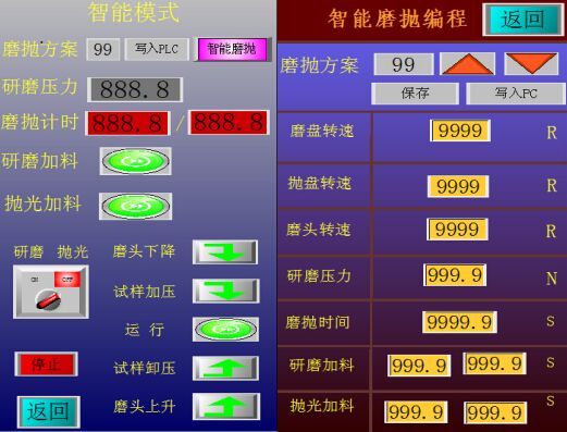 例如在磨抛碳钢件时直接在智能模式内的磨抛方案输入1,写如PLC。如需自动添加磨料就打开研磨加料。其他按键在操作时按顺序向下依次点击即可。
